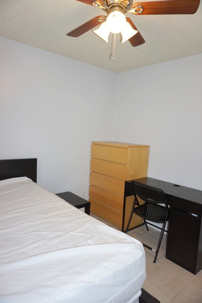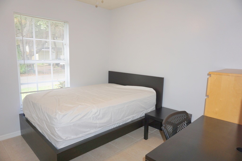 Private bedroom includes full sized bed, side table, dresser, desk and chair, closet.