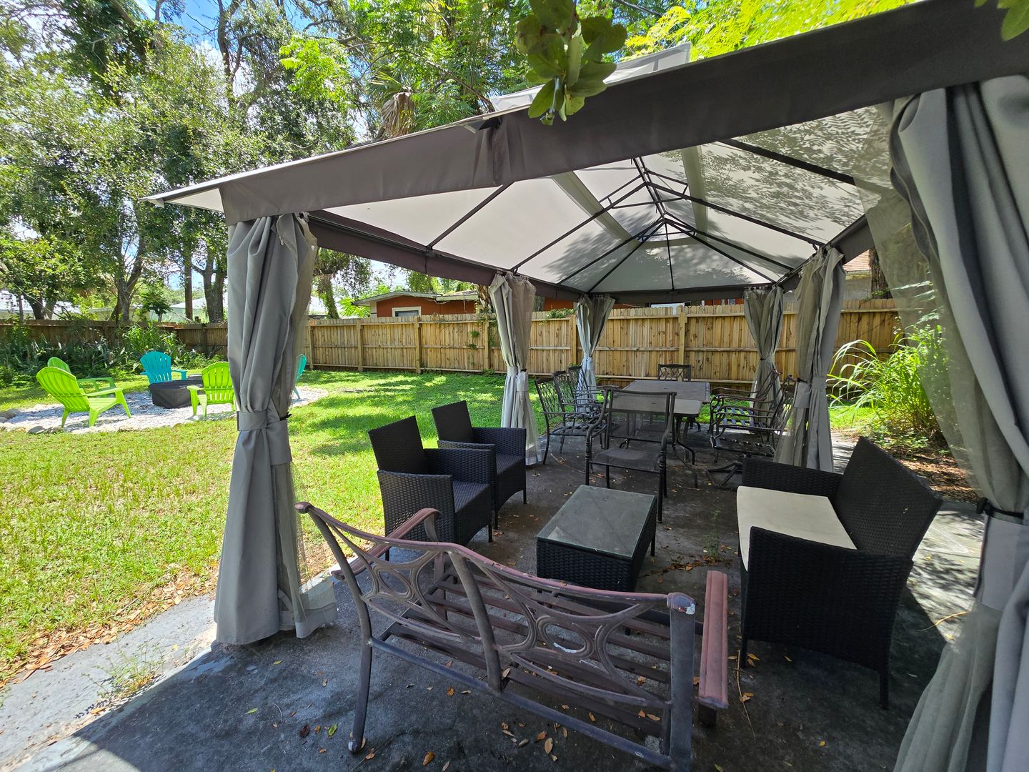 Blocks from Ringling College campus. Modern kitchen with mosaic glass tile back splash and newly remodeled modern bathrooms with naturals slate tile showers. Tile floors throughout house. Screened in lanai porch. Large yard with fire pit and gazebo.