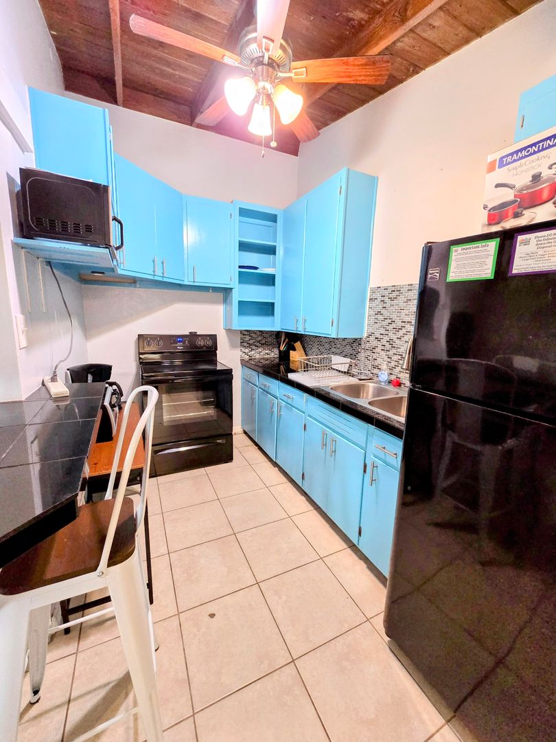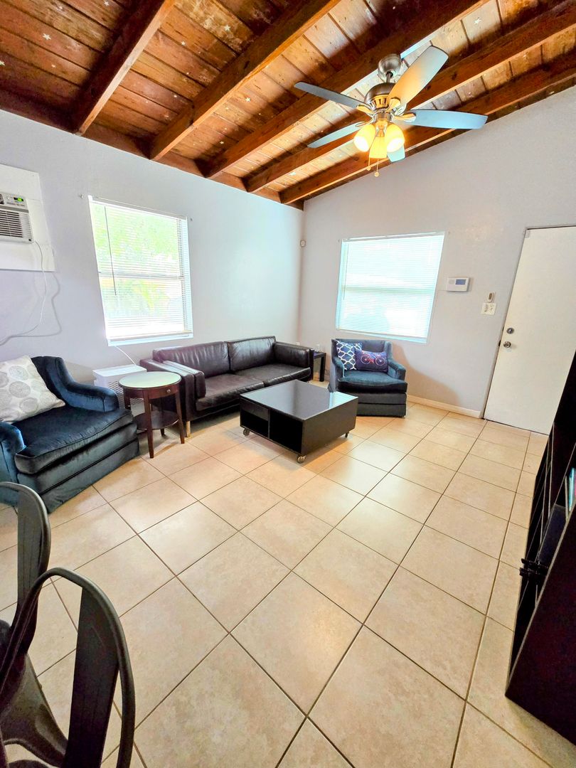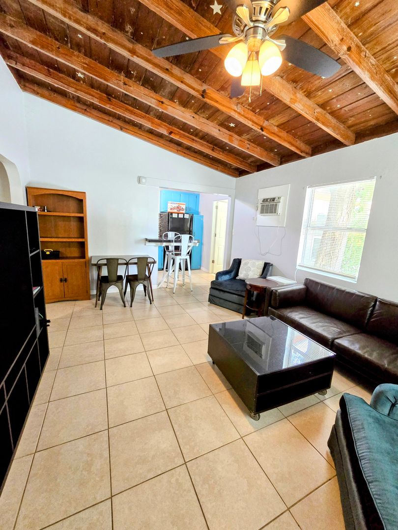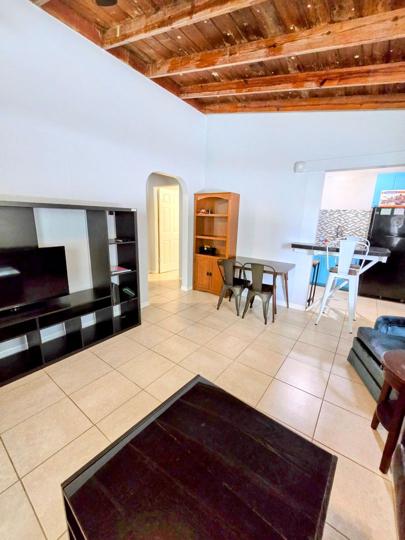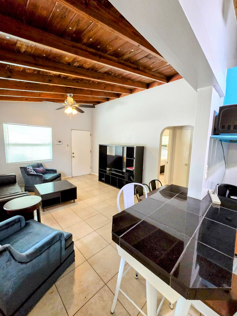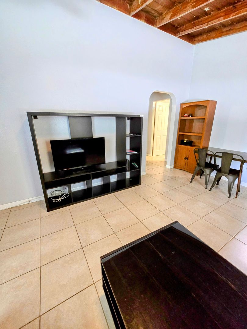 Enjoy the vintage terrazo floors throughout this Two Bedroom One Bath Apartment. The full kitchen boasts black granite countertops and modern metallic backsplash. Large living spaces with dining table, entertainment center and leather couches. There is private parking, fire pit and shared onsite laundry.