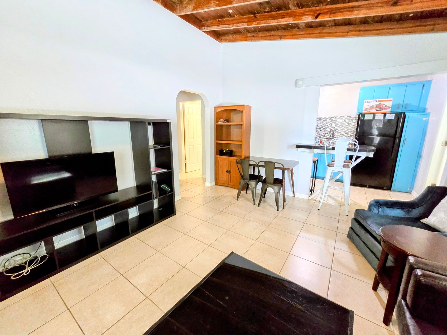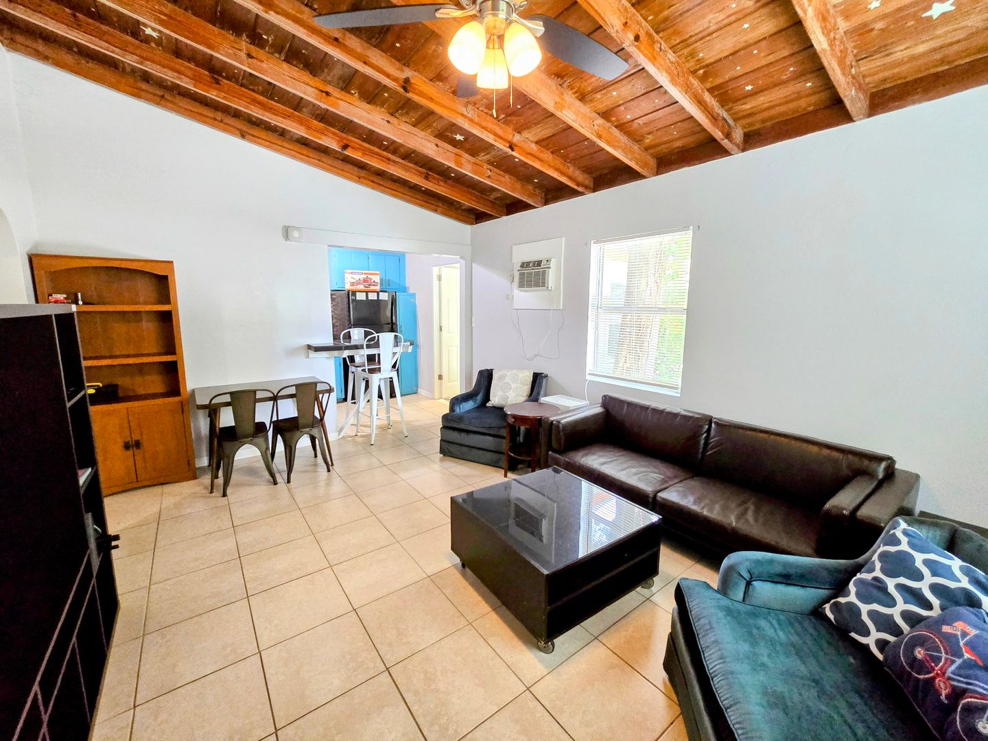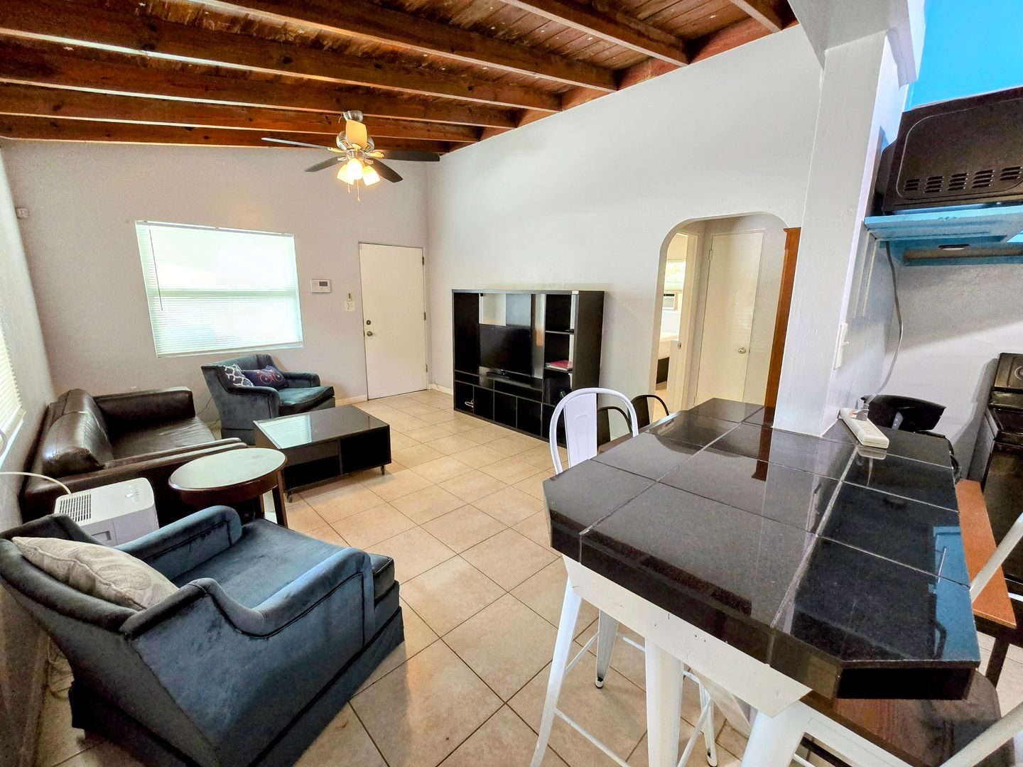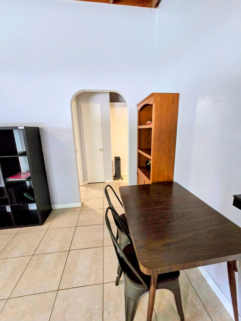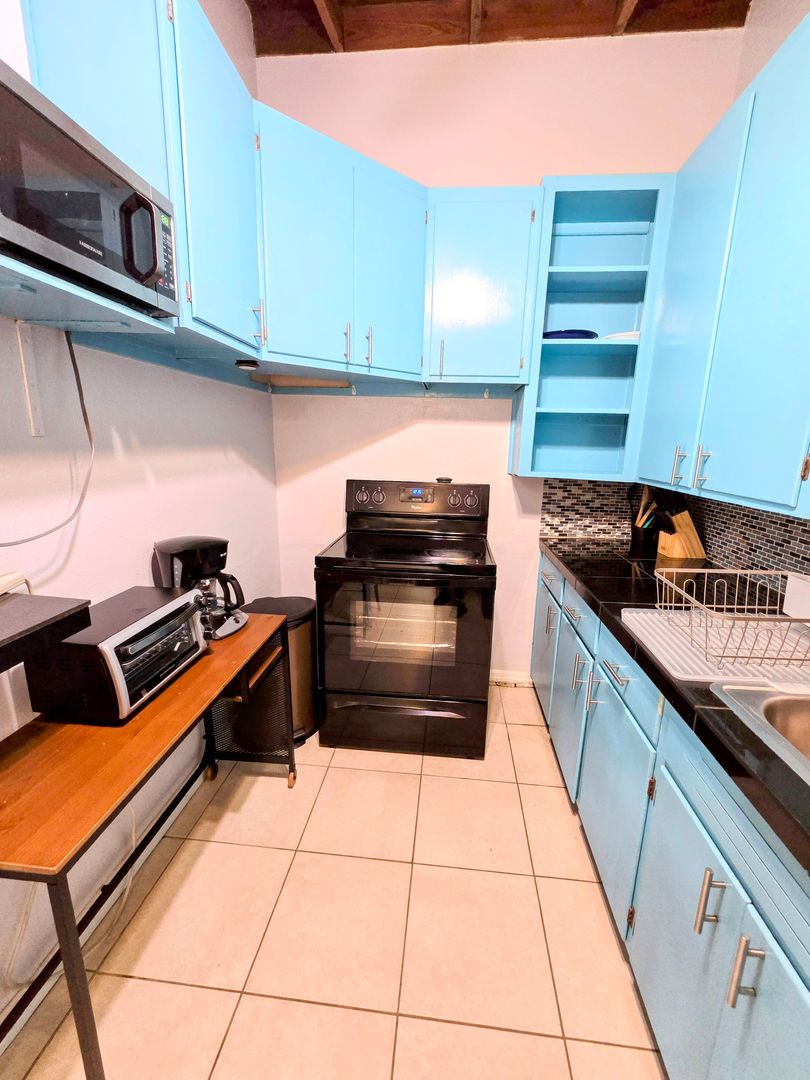 Enjoy the vintage terrazo floors throughout this Two Bedroom One Bath Apartment. The full kitchen boasts black granite countertops and modern metallic backsplash. Large living spaces with dining table, entertainment center and leather couches. There is private parking, fire pit and shared onsite laundry.