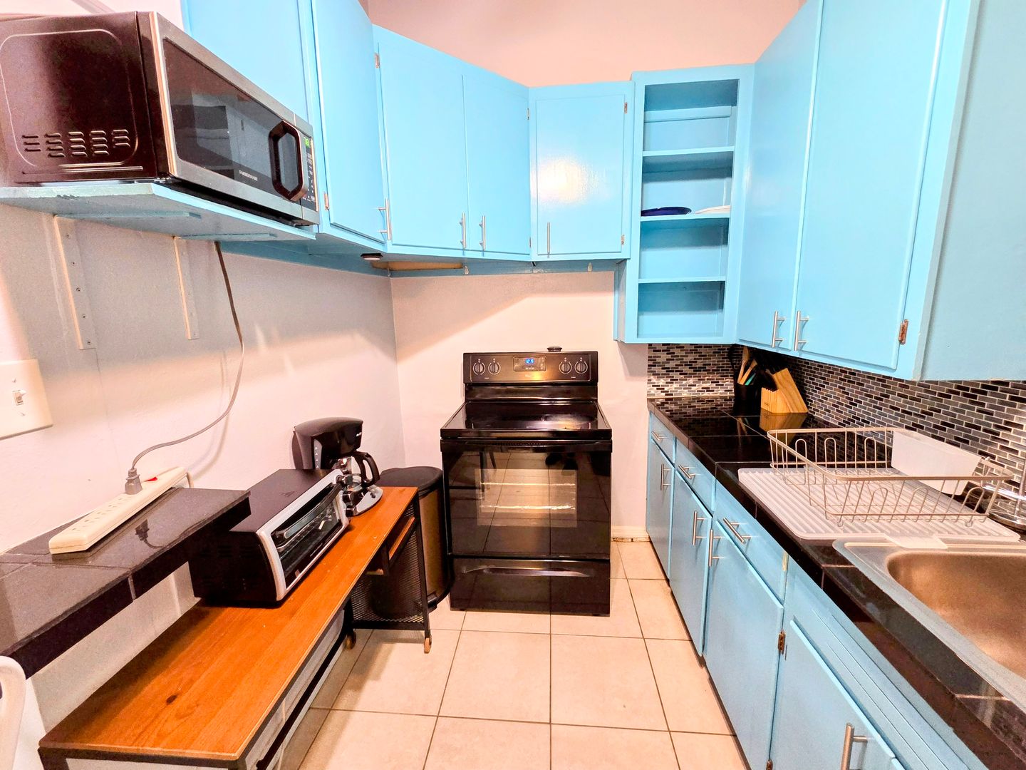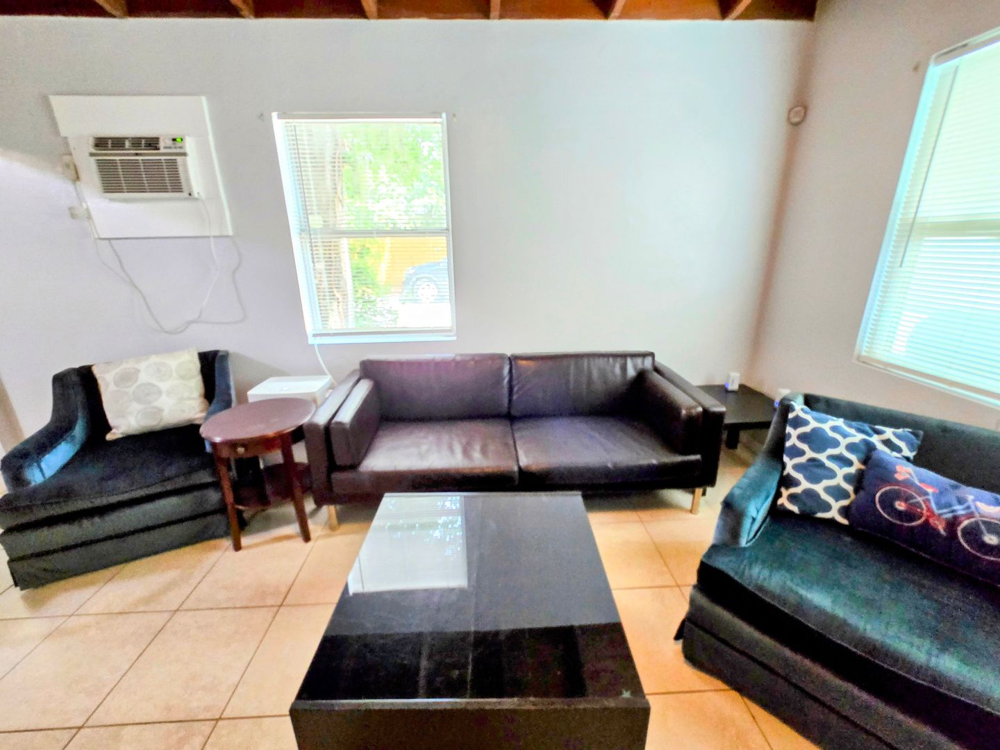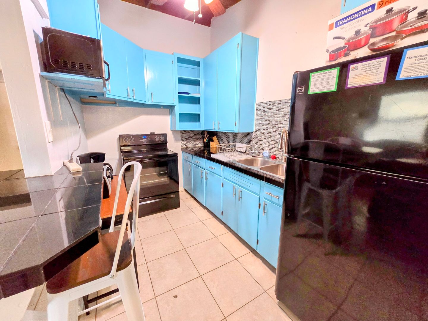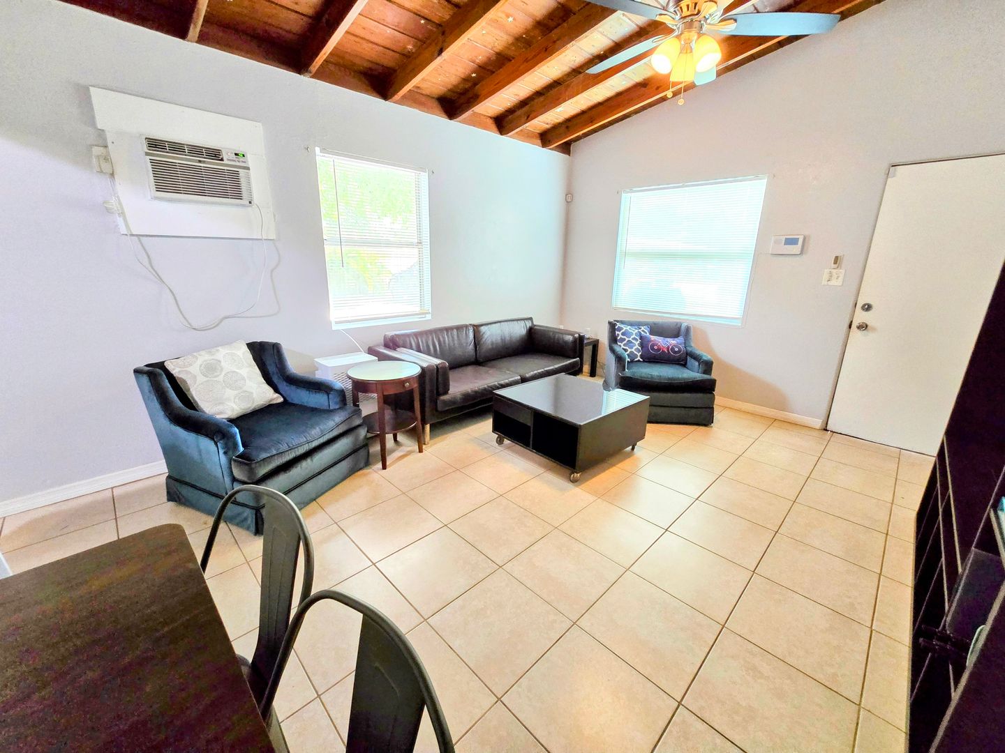 Enjoy the vintage terrazo floors throughout this Two Bedroom One Bath Apartment. The full kitchen boasts black granite countertops and modern metallic backsplash. Large living spaces with dining table, entertainment center and leather couches. There is private parking, fire pit and shared onsite laundry.