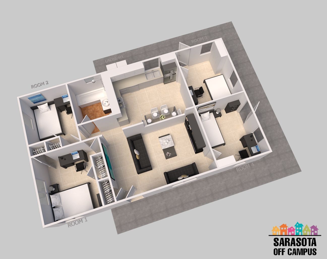 Fully Furnished with sofa, flat screen TV, dining table, bed, desk w/chair, closet or armoire, washer & dryer