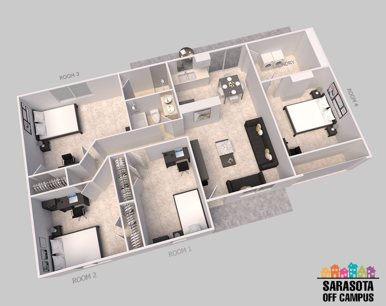 Fully Furnished with sofa, flat screen TV, dining table, bed, desk w/chair, closet or armoire, washer & dryer