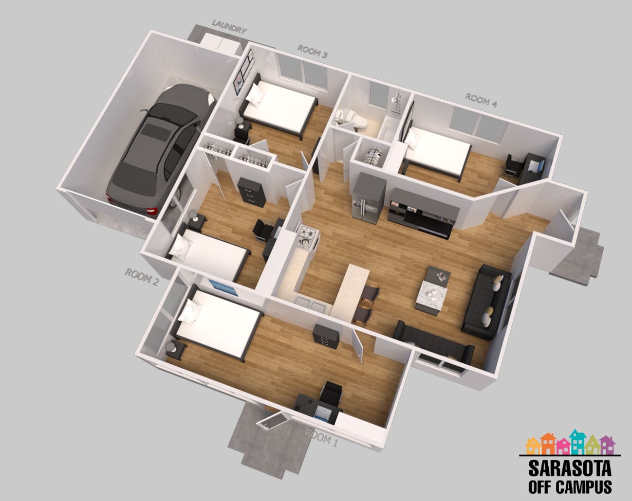 Fully Furnished with sofa, flat screen TV, dining table, bed, desk w/chair, closet or armoire, washer & dryer